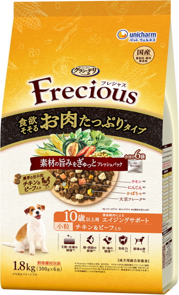 素材の旨みをぎゅっとフレッシュパックした国産プレミアムドッグフードです。食欲そそるお肉たっぷり設計※(チキンとビーフの濃厚な旨み粒、フリーズドライのチキン入り)。ドライ粒とフリーズドライ・エアドライの素材を、酸化を防ぐ鮮度維持包装をすることで、いつでも美味しくワンちゃんが喜びます。10歳以上向けの栄養バランスで、愛犬が大好きなチキン&ビーフ入り。小粒設計。※Frecious10歳以上用比約120%
