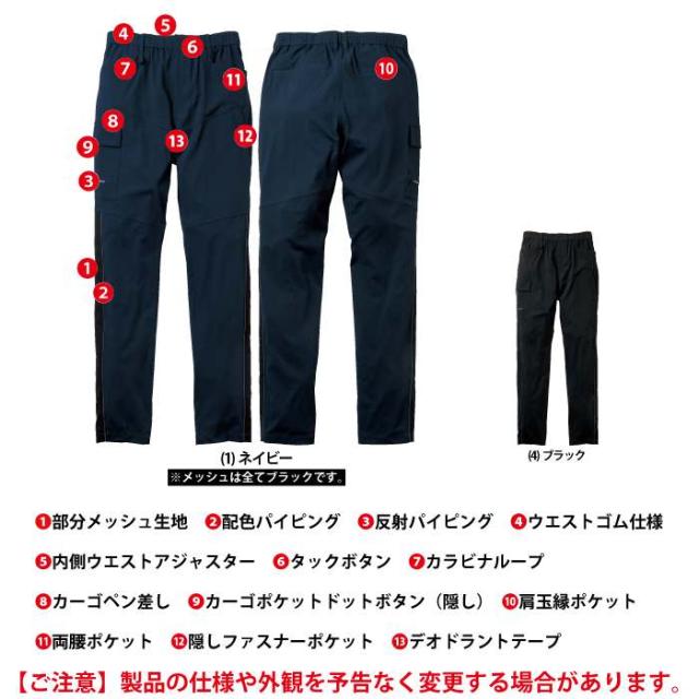 ◇機能:部分メッシュ生地・配色パイピング・反射パイピング・ウエスト総ゴム仕様・内側ウエストアジャスター・タックボタン・カラビナループ・カーゴペン差し・カーゴポケットドットボタン(隠し)・両腰ポケット・隠しファスナーポケット