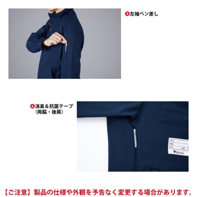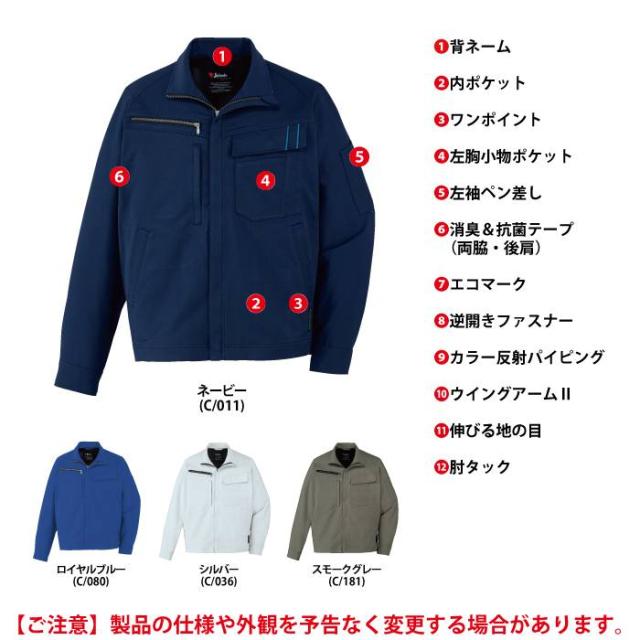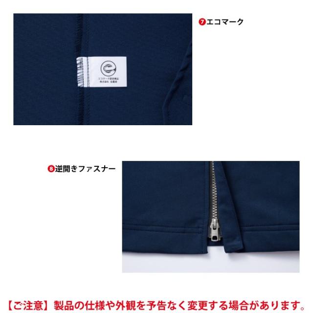 ◇機能:背ネーム・内ポケット・ワンポイント・左胸小物ポケット・左袖ペン差し・消臭と抗菌テープ(両脇・後肩)・エコマーク・逆開きファスナー・カラー反射パイピング・カラー反射パイピング (反射時)・ウイングアームII・伸びる地の目・肘タック