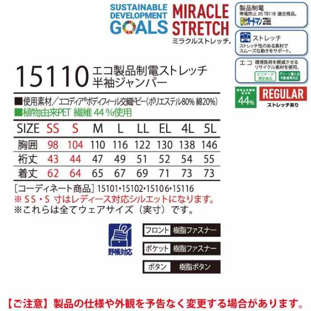 15110 エコ製品制電ストレッチ半袖ジャンパー