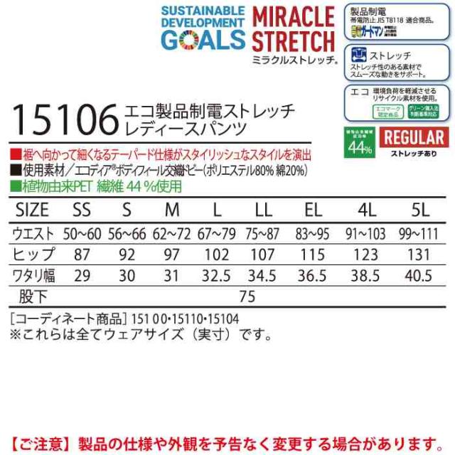 【15106 エコ製品制電ストレッチレディースパンツ】