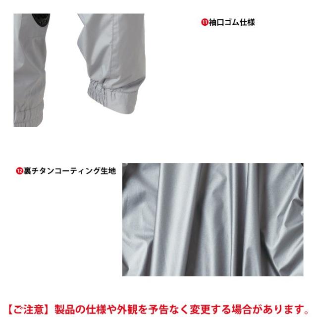 ◇機能:エアースルーネック・衿裏メッシュ・横付ファン・ファスナー引手・胸ファスナーポケット・反射パイピング・ファン取付孔(直径約90mm)・袖ペン差し・ウエストゴム仕様・両側脇ポケット・袖口ゴム仕様