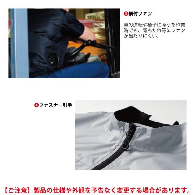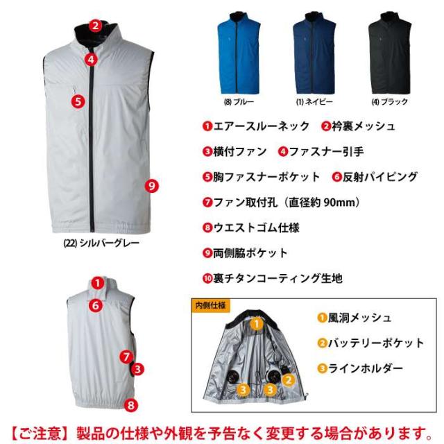 ◇機能:エアースルーネック・衿裏メッシュ・横付ファン・ファスナー引手・胸ファスナーポケット・反射パイピング・ファン取付孔(直径約90mm)・ウエストゴム仕様・両側脇ポケット