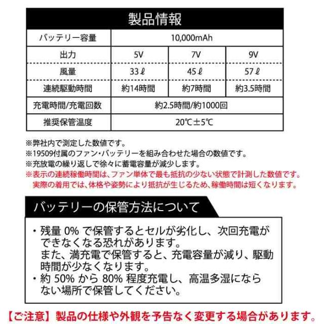 ◇出力/風量/連続駆動時間:5V/33L/約14時間:7V/45L/約7時間:9V/57L/約3.5時間(バッテリー容量10000mAh)