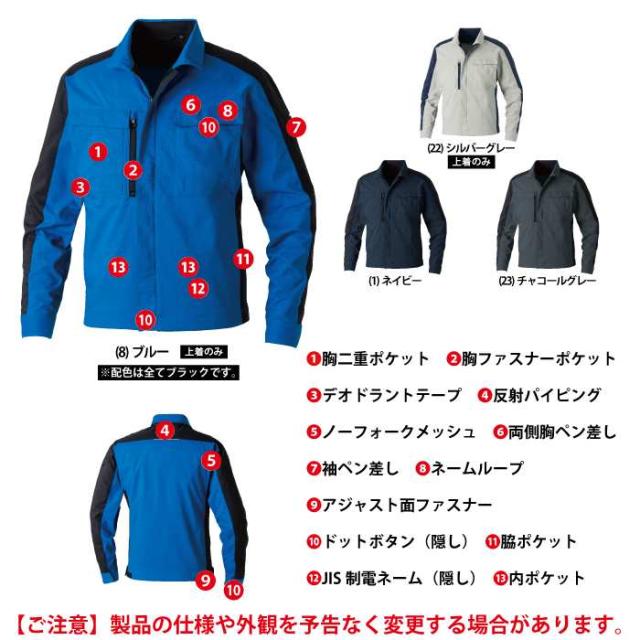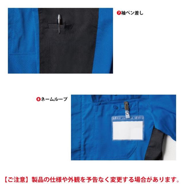 ◇機能:胸二重ポケット・胸ファスナーポケット・デオドラントテープ・反射バイピング・ノーフォークメッシュ・両側胸ペン差し・袖ペン差し・ネームループ・アジャスト面ファスナー・ドットボタン(隠し)・脇ポケット・JIS静電ネーム(隠し)・内ポケット・ユニセックス対応