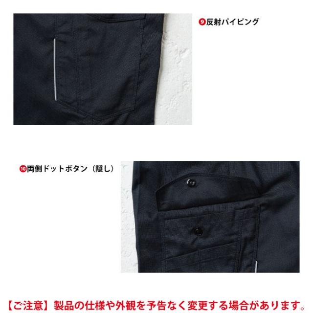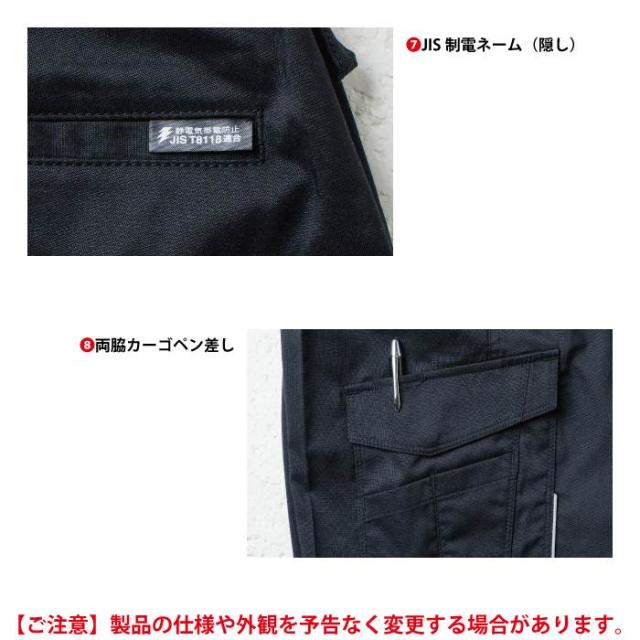 ◇機能:前カン・デオドラントテープ・両側カーゴポケット・後ろ太ベルトループ・脇ゴム仕様・カラビナループ・JIS制電ネーム(隠し)・両側カーゴペン差し・反射パイピング・両側ドットボタン(隠し)・ユニセックス対応