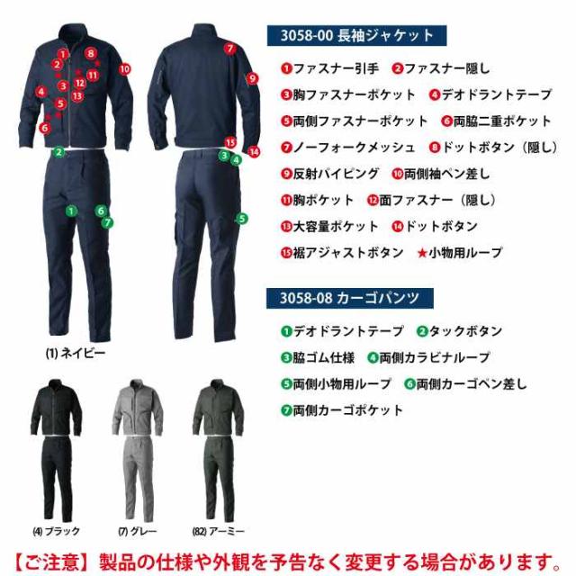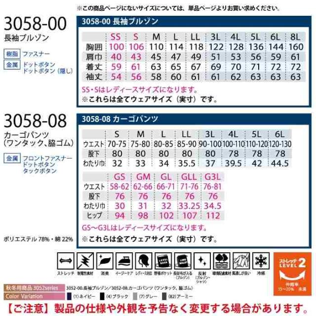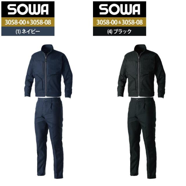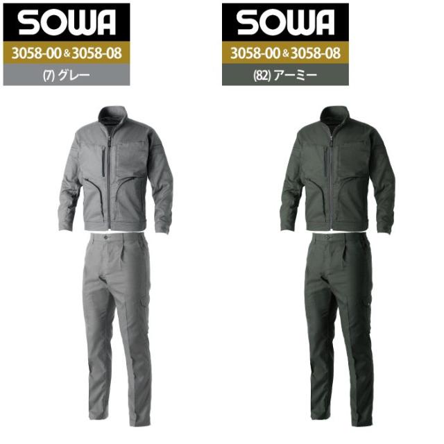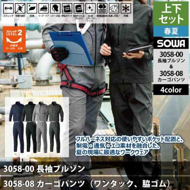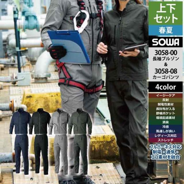 桑和 SOWA 作業服 上下セット 3058-00 長袖ブルゾンS-3L と 3058-08 カーゴパンツ(ワンタック脇ゴム) GS-3L 作業着 作業ズボン 春夏用
