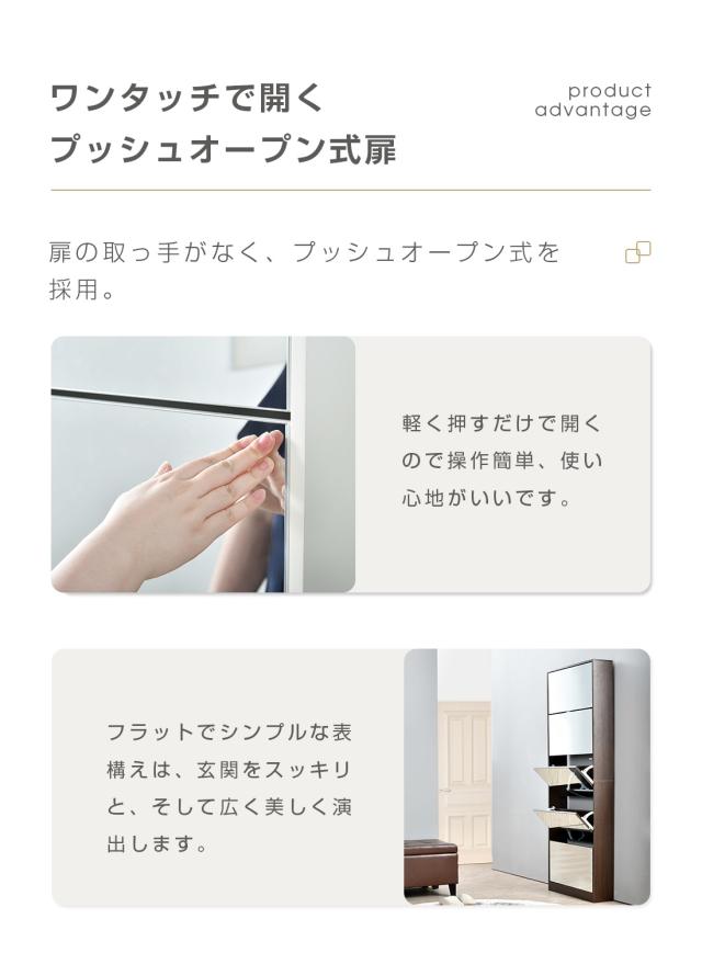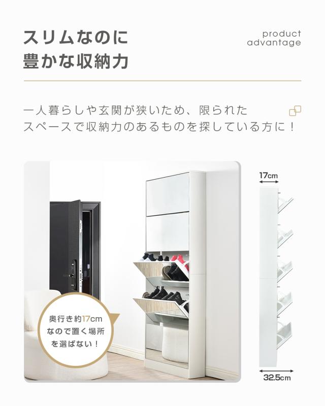 【使いやすさにも、見た目にもこだわりを】より使いやすく、より美しくにこだわり、設計に工夫を施しました。奥行きは17cmとコンパクトに仕上げ、余裕の少ない玄関スペースにも置きやすいサイズ感。