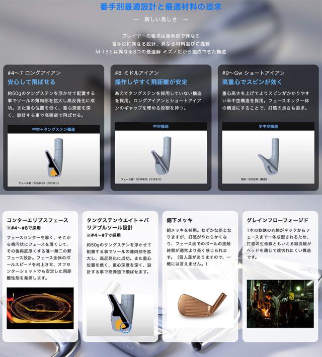 | 素材 | フェースネック:クロムモリブデン鋼(SCM435)精密鍛造/4135 バック:ソフトステンレススチール(SUS431)精密鋳造、タングステンウエイト(No.4〜7のみ) |