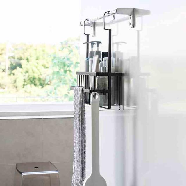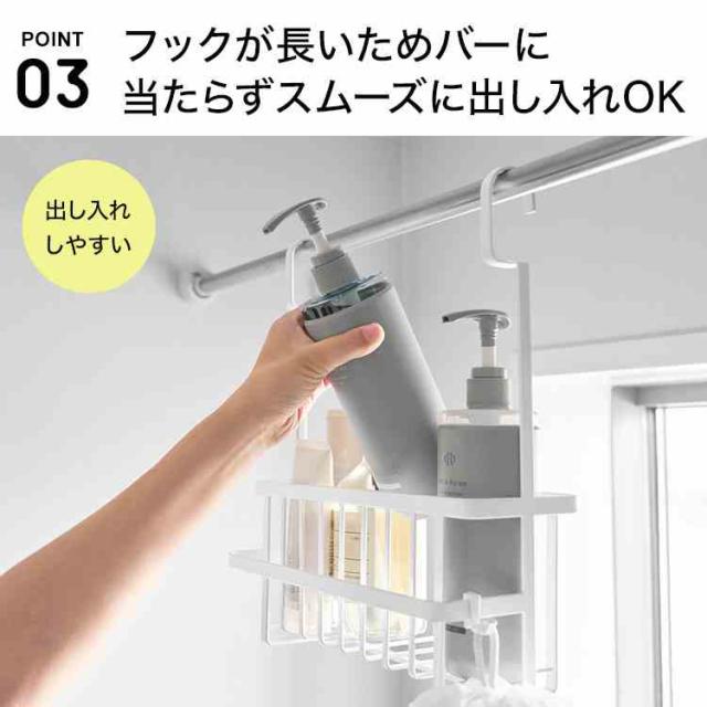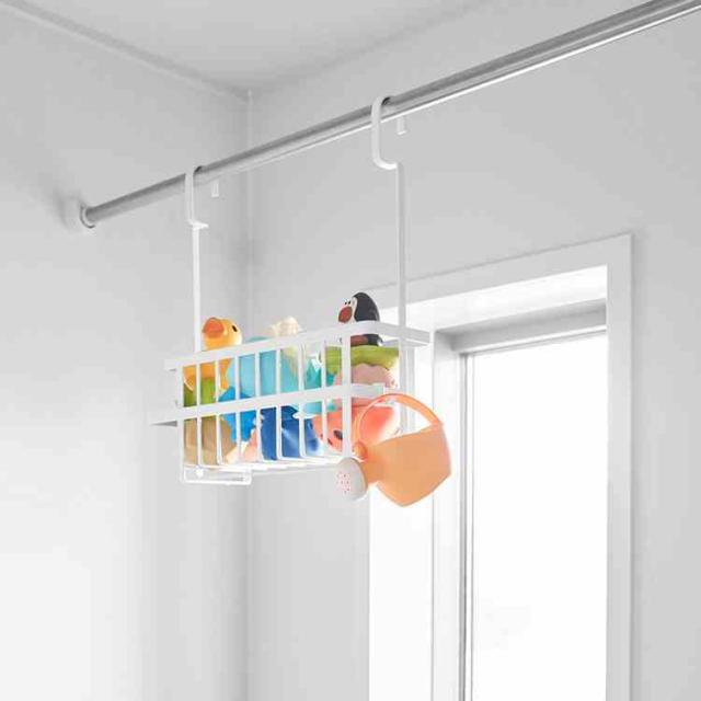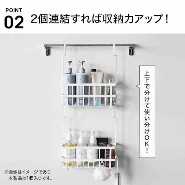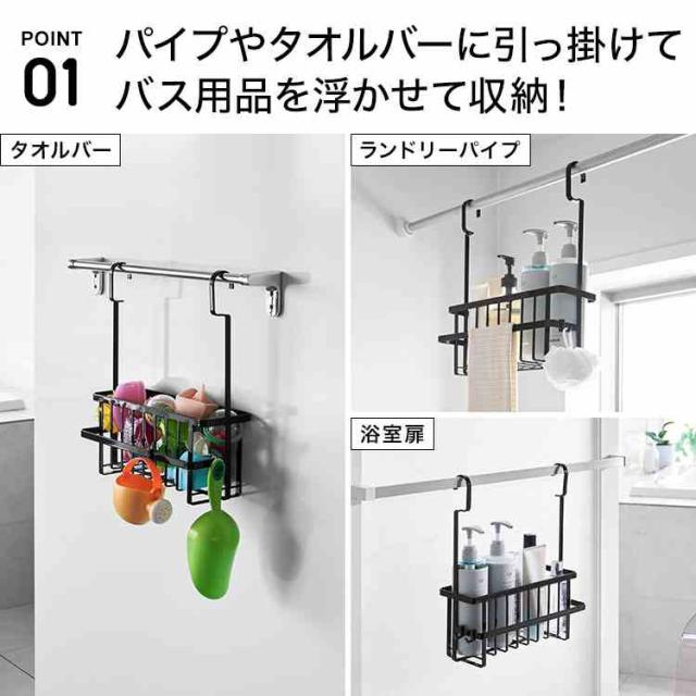 ランドリーパイプに引っ掛けて、バス用品や掃除用品を浮かせて収納できる連結可能なバスケットです。ディスペンサーやチューブ類、おもちゃなどをまとめて収納でき、手前のバーにはタオルなどを掛けられます。上下に連結すれば収納力がアップし、用途に合わせて使い分け可能。