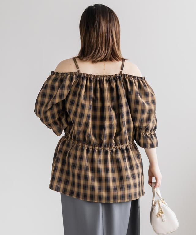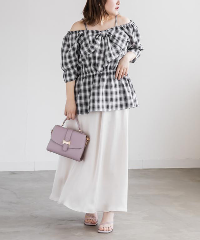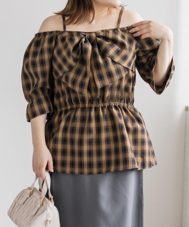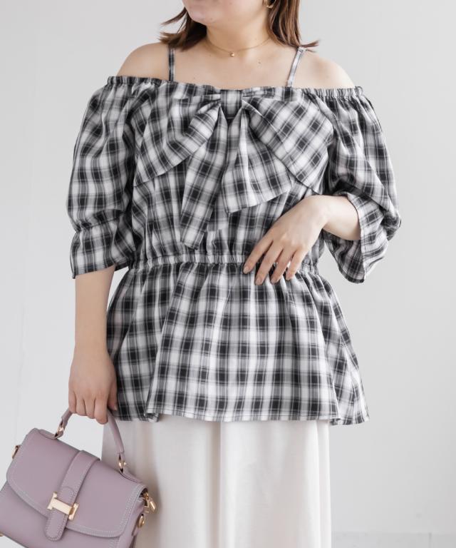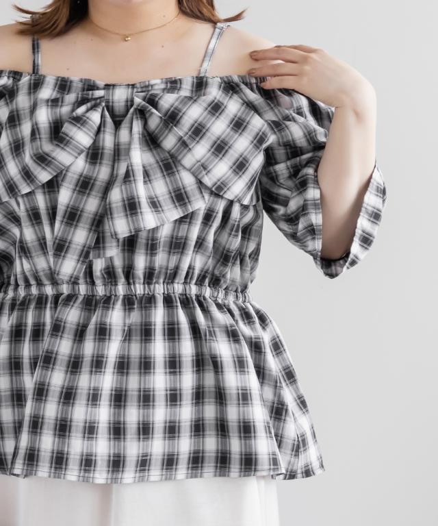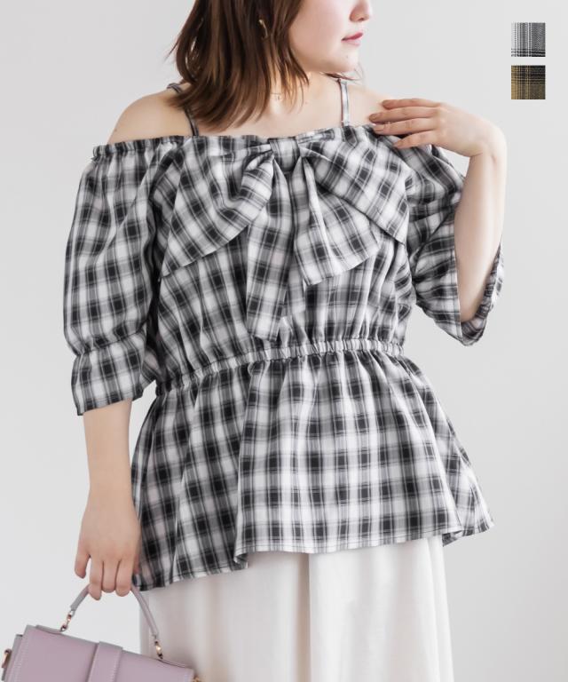 大きいサイズ/レディース/3L/4L/チェック柄フロントリボンオフショルチュニック