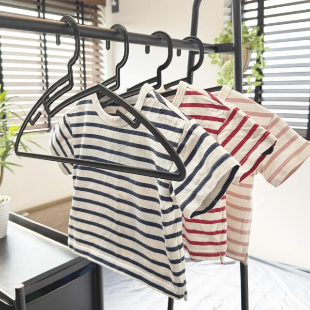 通常は「子供用」「大人用」とハンガーを分けがちですが、このハンガーなら1本で家族みんなOK。襟首を伸ばさず掛けられるので、子供服から大人サイズまで共通で使えます。