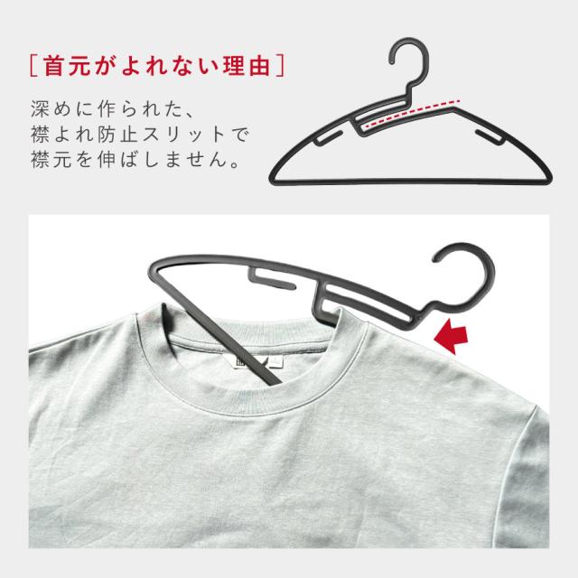 ZEROシャツハンガーS1は、襟よれ防止スリット付き。深めに作られたスリットが、襟を伸ばさず型崩れを防ぐ形状。首元を無理に引っ張らず掛けられます。