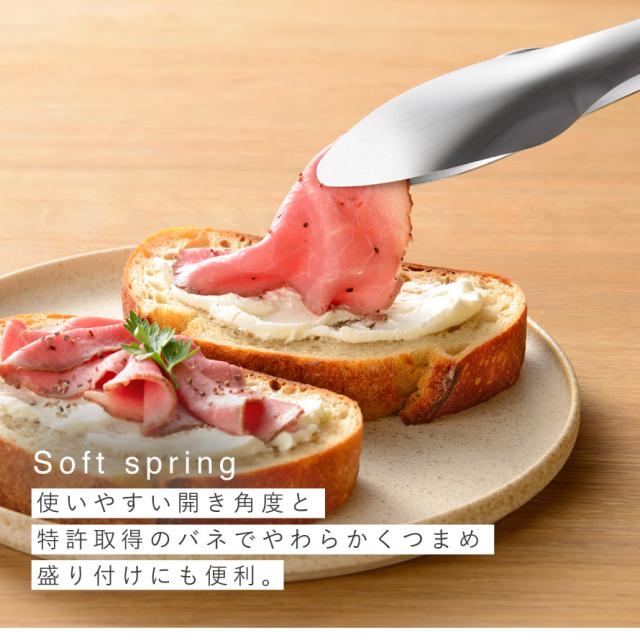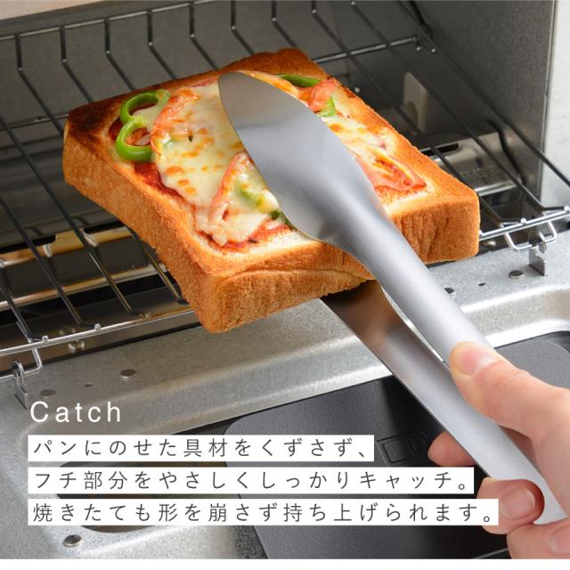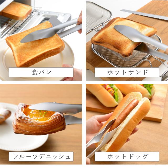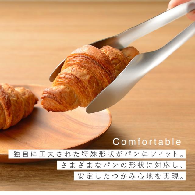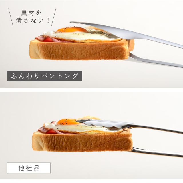 パンをつぶさず、ふんわりつかめる「ふんわりパントング」。トーストやパンにのせた具材をくずさず、フチ部分をやさしくしっかりキャッチ。焼きたてパンも形を崩さず持ち上げられる、パン専用設計のトングです。