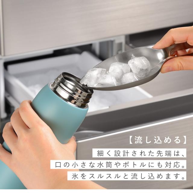 細く設計された先端は、口の小さな水筒やボトルにも対応。氷をスルスルと流し込めるので、直接手を入れたりこぼしたりするストレスを減らします。