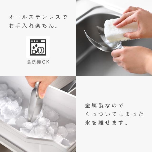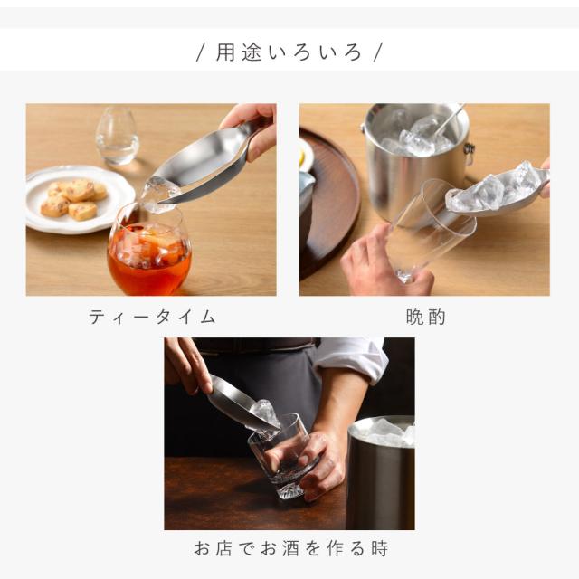 少量の氷はトングとして、多めに入れたいときはスコップのようにすくって使用可能。用途に合わせて使い分けでき、ドリンク準備がスムーズに行えます。
