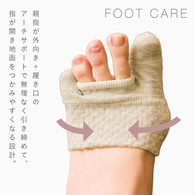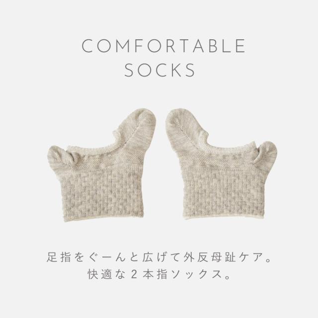 外反母趾ケアに。足指をぐーんと広げて快適な2本指タイプのソックス。親指、小指に通す2本指タイプ。親指が外向き+履き口のアーチサポートで無理なく引き締めます。
