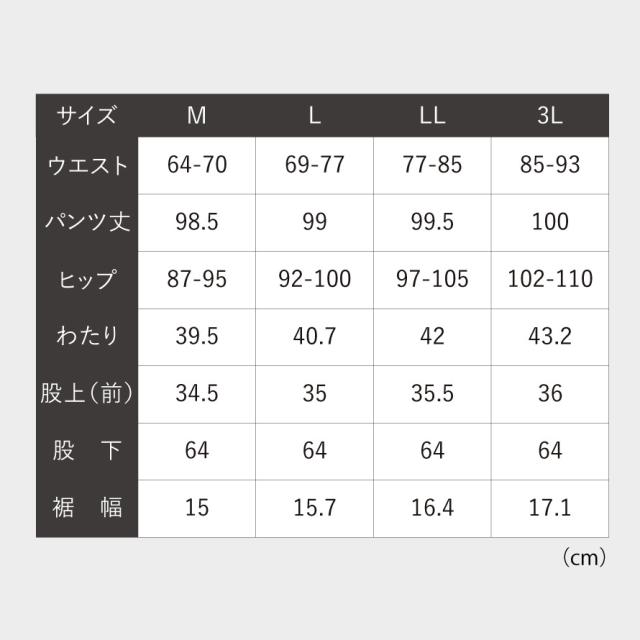■サイズ:M/ウエスト64-70、ヒップ87-95、パンツ丈98.5、わたり39.5、股上(前)34.5、股下64、裾幅15、L/ウエスト69-77、ヒップ92-100、パンツ丈99、わたり40.7、股上(前)35、股下64、裾幅15.7、LL/ウエスト77-85、ヒップ97-105、パンツ丈99.5、わたり42、股上(前)35.5、股下64、裾幅16.4、3L/ウエスト85-93、ヒップ102-110、パンツ丈100、わたり43.2、股上(前)36、股下64、裾幅17.1cm