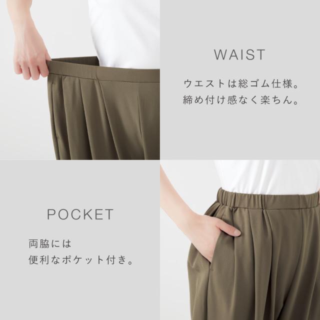 左右には便利なポケット付き。ウエストは総ゴム仕様でリラックス。
