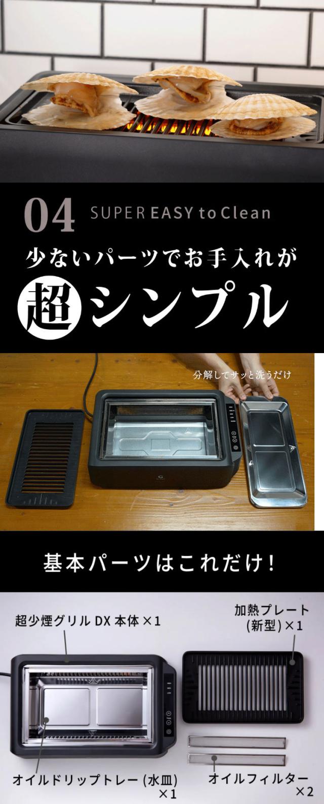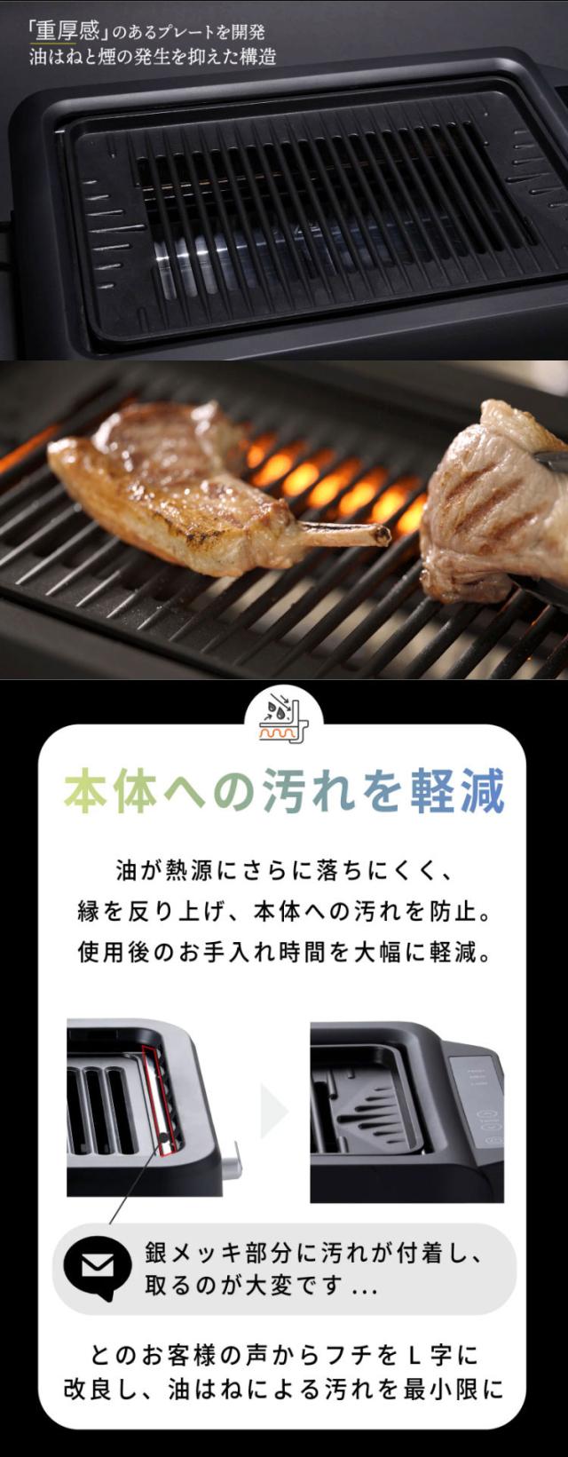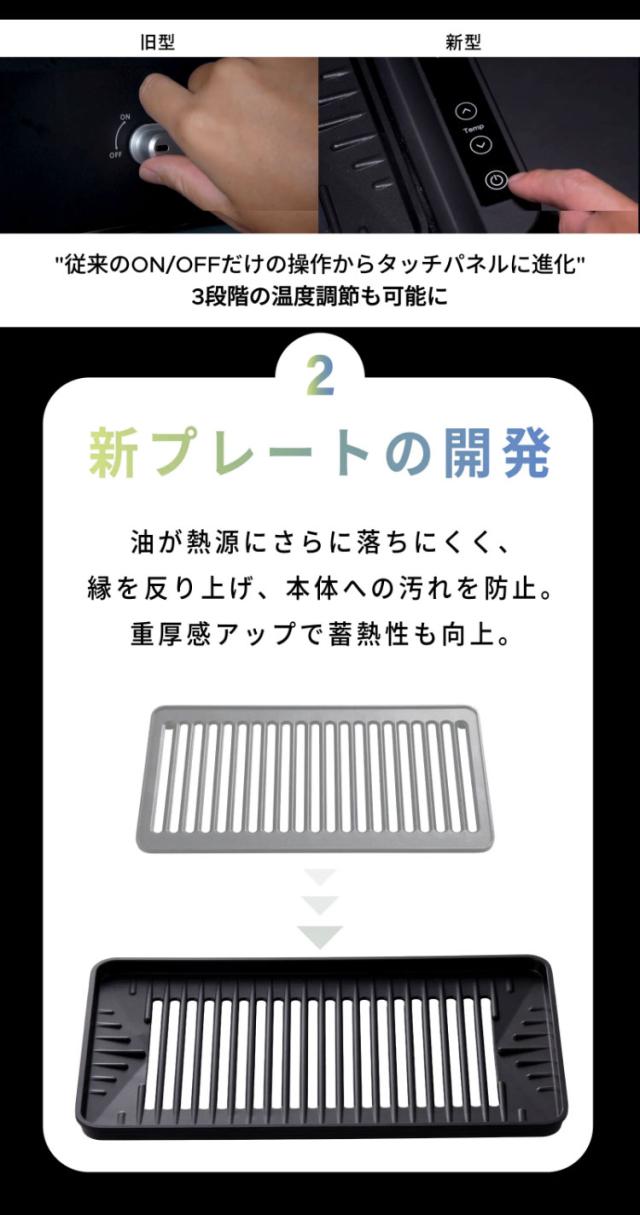 さらにグリルプレートが進化し油ハネを抑え、より油を落としやすい構造になっていて、煙の発生をより抑える仕組みです。