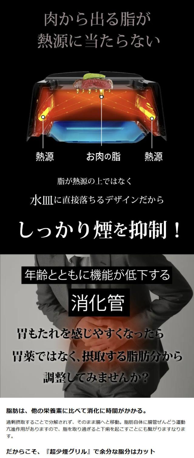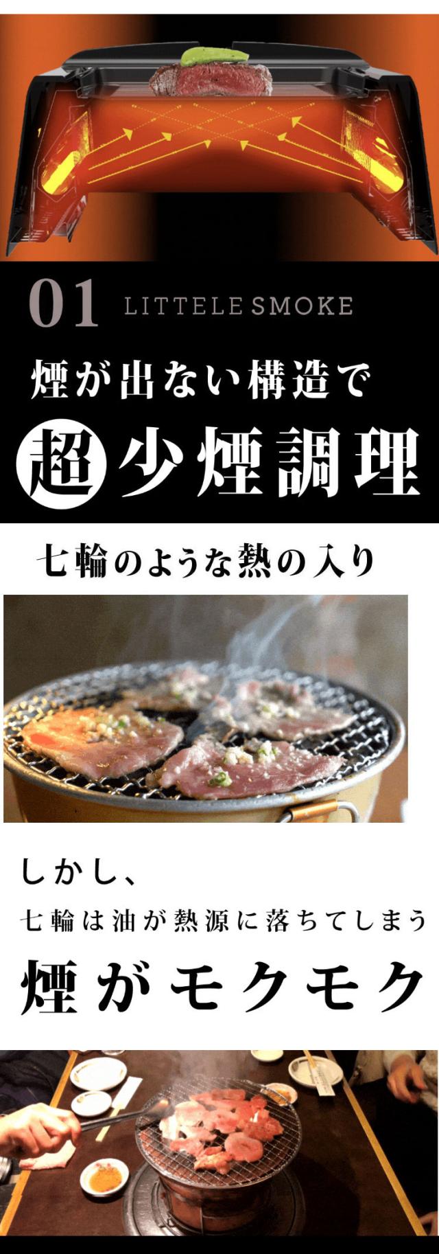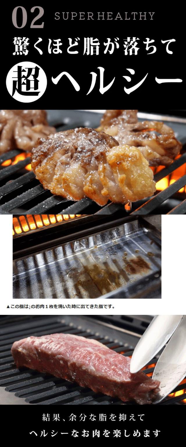 熱源をグリルのサイドに配置し、油を下に落とすので、油と熱源が触れないことで煙が出ない構造。