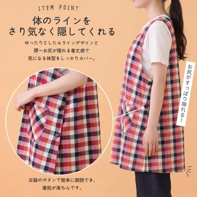 ゆったりとしたAラインデザインと 腰~お尻が隠れる着丈感で 気になる体型をしっかりカバー。 左脇のボタンで簡単に開閉でき、 着脱が楽ちんです。