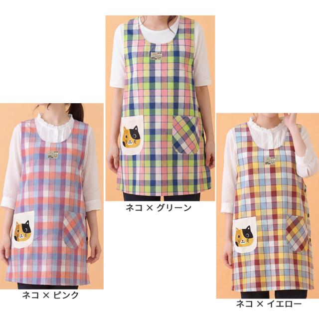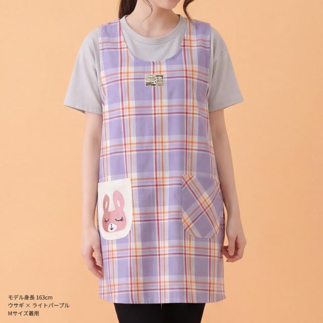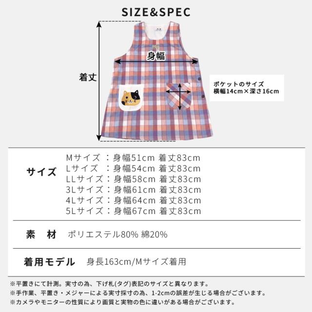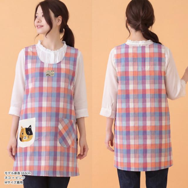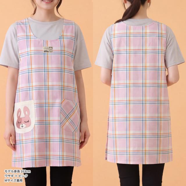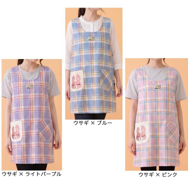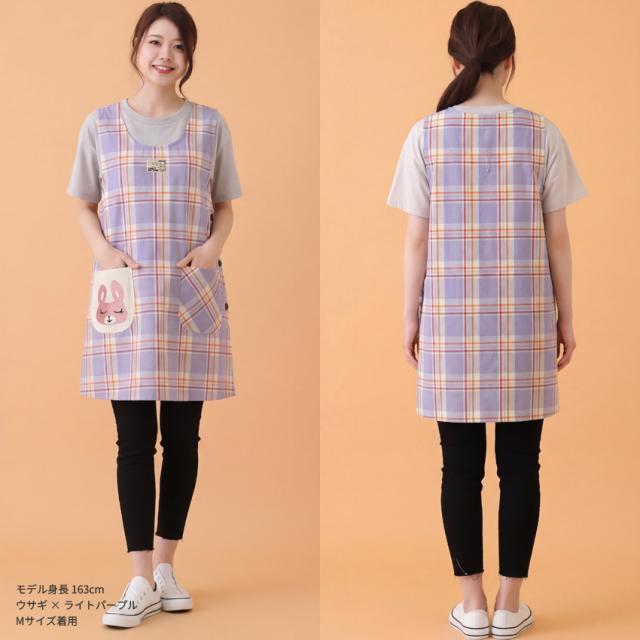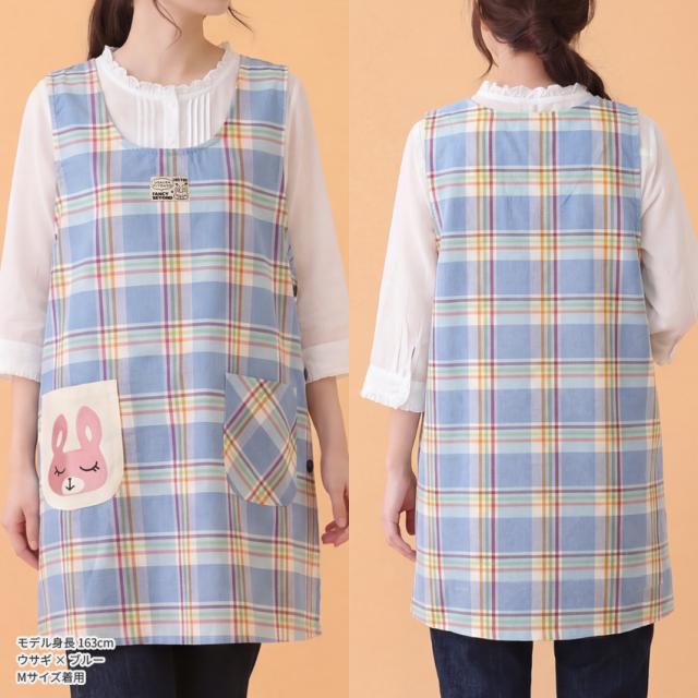 M~5Lサイズ お尻が隠れるアニマルエプロン ワンピース エプロン チェック 猫 ネコ イヌ ウサギ ベスト 綿 ポリエステル ダブリエ チェック柄 保育士 ロング ユニフォーム シンプル かわいい 大きいサイズ レディース M L LL 2L 3L 4L 5L 大きいサイズ キャラクター