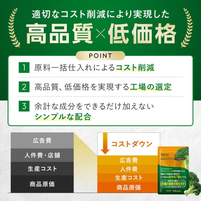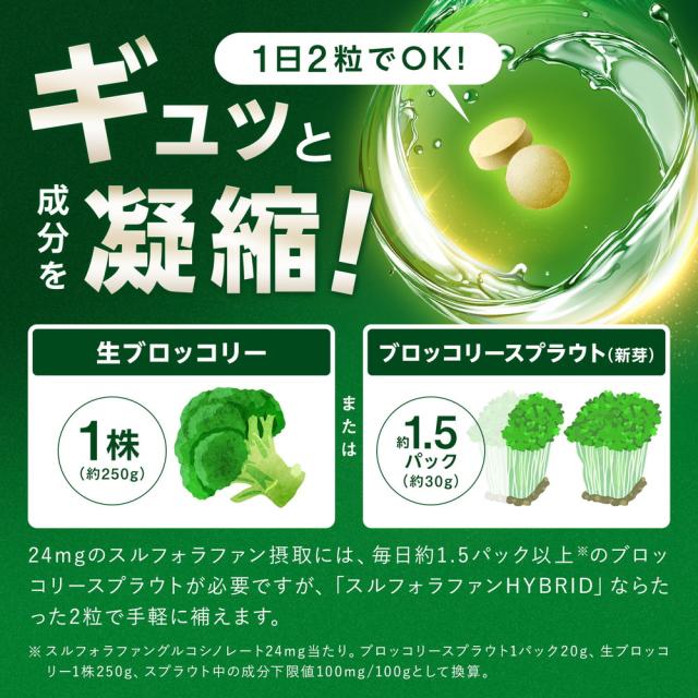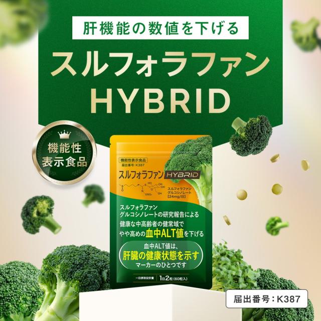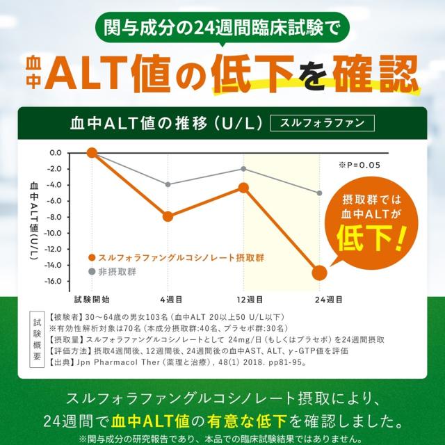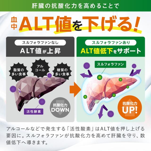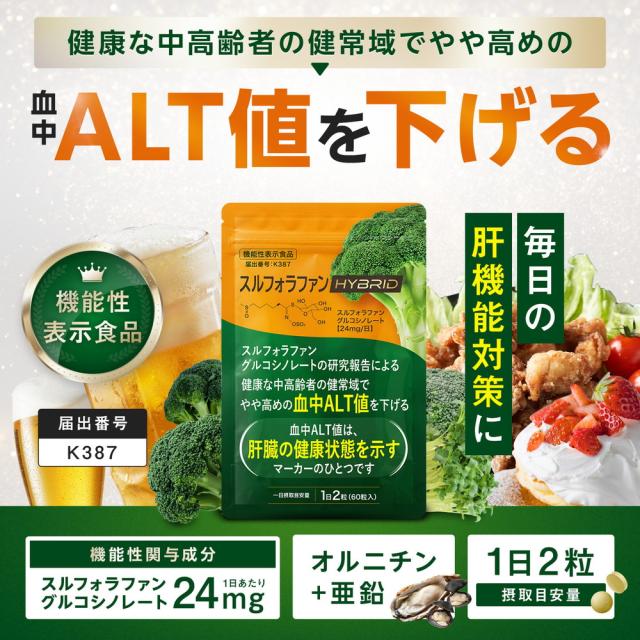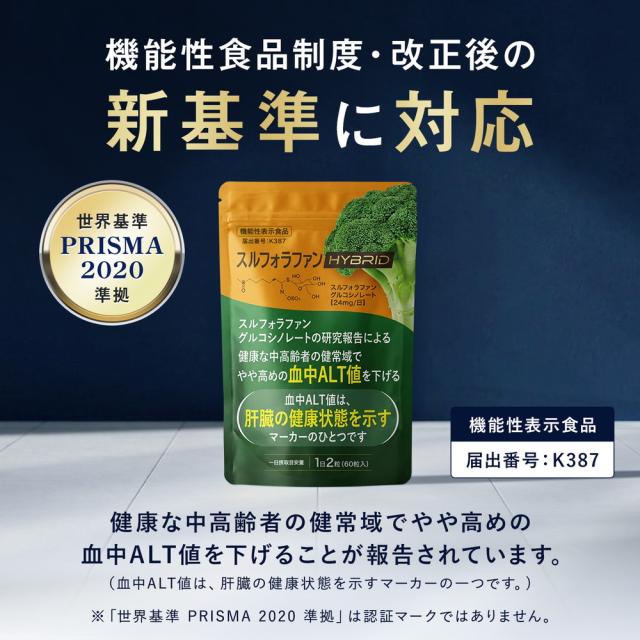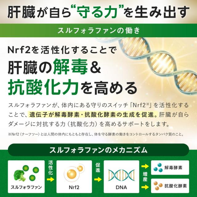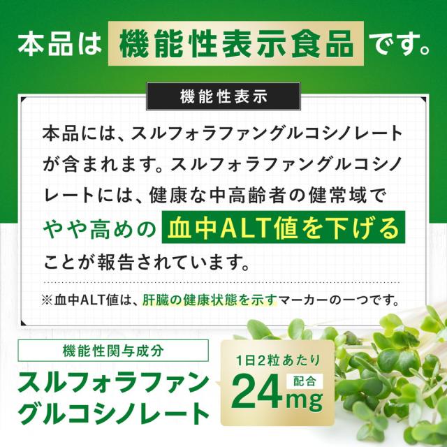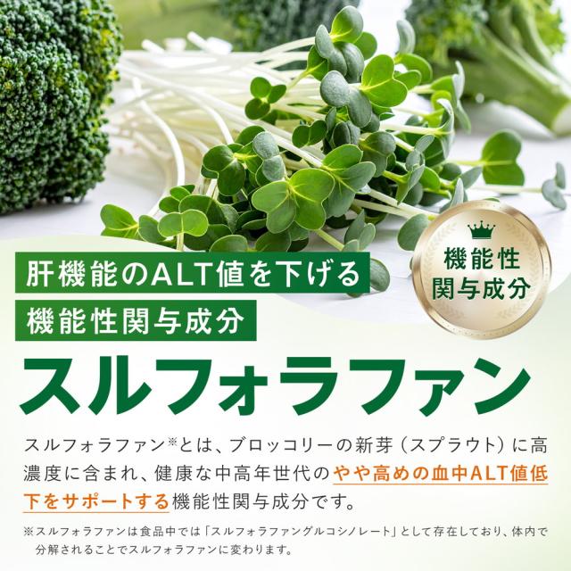 【機能性表示食品 (届出番号K387)】 届出表示/本品にはスルフォラファングルコシノレートが含まれます。スルフォラファングルコシノレートには、健康な中高齢者の健常域でやや高めの血中ALT値を下げることが報告されています。(血中ALT値は、肝臓の健康状態を示すマーカーの一つです。) 機能性関与成分/スルフォラファングルコシノレート:24mg/日