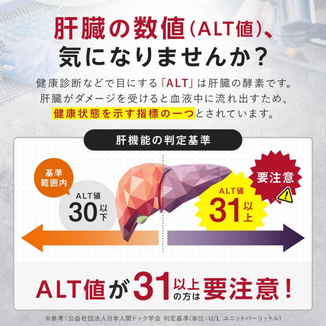 【肝機能の数値を下げる】本品は機能性表示食品です。健康な中高齢者の健常域でやや高めの血中ALT値を下げることが報告されています。肝臓の数値が気になる方や、お酒を飲む機会が多い方の、毎日の肝機能対策におすすめです。