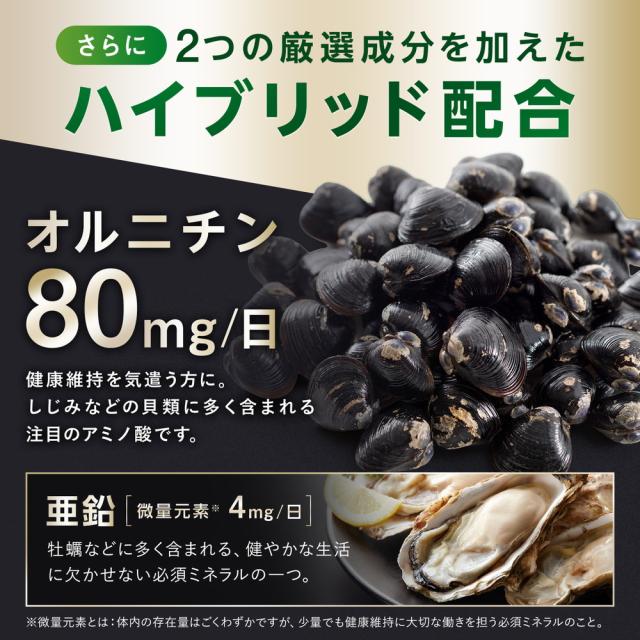 【オルニチンと亜鉛のハイブリッド配合】スルフォラファンだけじゃない、さらに2つの成分を加えました。しじみなどに多く含まれる注目のアミノ酸である「オルニチン」と、牡蠣などに多く含まれる必須ミネラルの一つ「亜鉛」を配合しております。