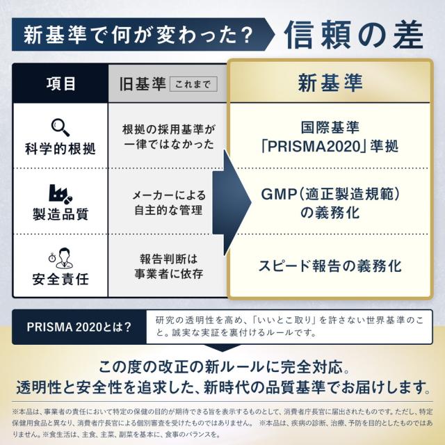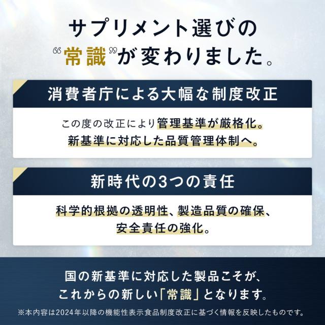 【新基準に対応】この度の機能性食品制度の改正により、サプリメント選びの常識が変わりました。科学的根拠の透明性、製造品質の確保、安全責任の強化など管理基準が厳格化されています。本品はこの新ルールに完全対応し、透明性と安全性を追求した新時代の品質基準でお届けします。