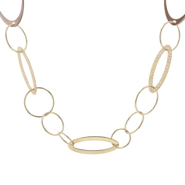 | 商品紹介 | 異なるフォルムのリングパーツがランダムに連なるデザインネックレスです。 長めのチェーンがゆったりとした存在感を演出しつつ、留め具付近にさりげなく添えられた一粒のダイヤモンドが、控えめなきらめきをプラスするデザインです。 |