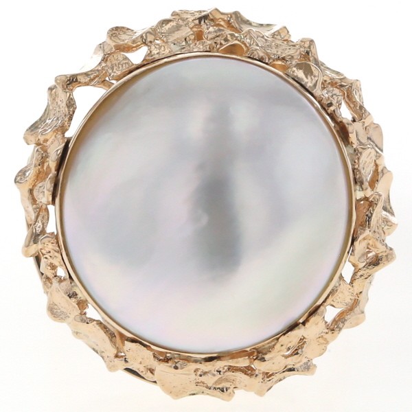 | 商品紹介 | 大粒のマベ真珠(ハーフパール)を主役にしたイエローゴールドリング。 ジオメトリックな彫金と透かしデザインが個性的な立体感を生み、やわらかな光沢とともに上品で印象的な存在感を指元に添える一品です。 |