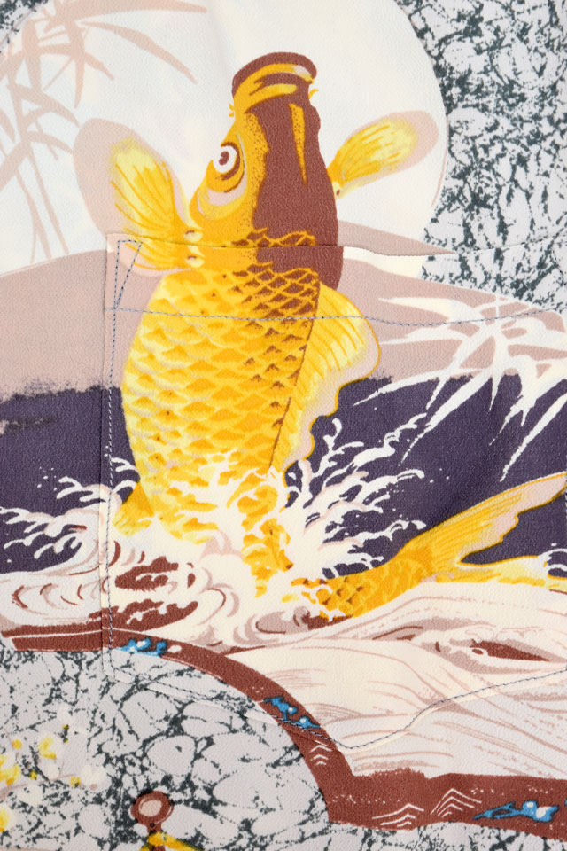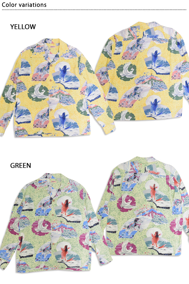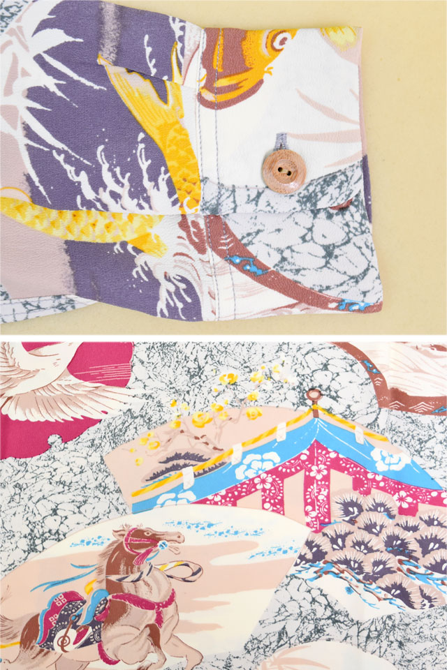 アロハシャツの黄金時代とされる1930〜50年代にかけて作られた「ヴィンテージ」と呼ばれる貴重なアロハシャツを再現し、現代に蘇らせているブランド「SUN SURF」から、長袖レーヨンアロハシャツ「JAPANESE QUAINT DESIGN」(SS29604)のご紹介です。 雪解けに由来し、豊作を願う意味を持つ雪輪や扇といった吉祥文様で柄を囲い、鯉、騎馬、鶴などのオリエンタルな要素の強いモチーフがシャツ全体に散りばめられた作品。 ボディーには、レーヨン生地を採用。 両胸にはポケットが縫い付けられています。 | ||||||||||||||||||||||||||||||
