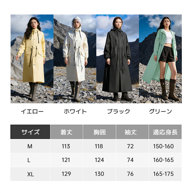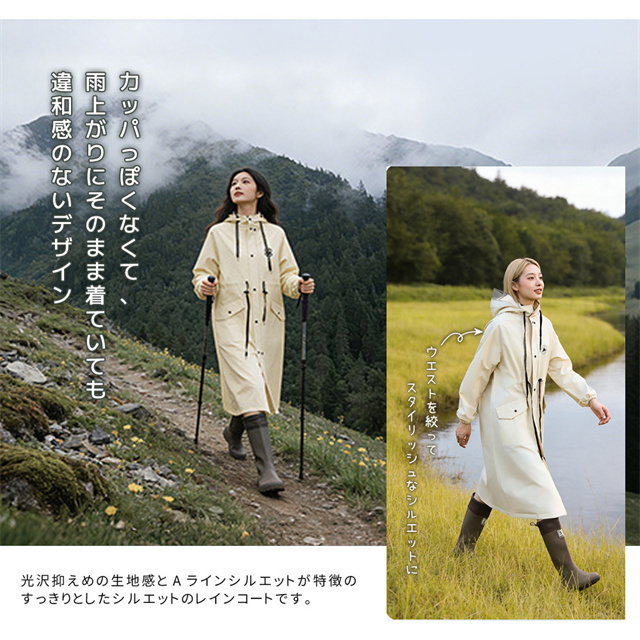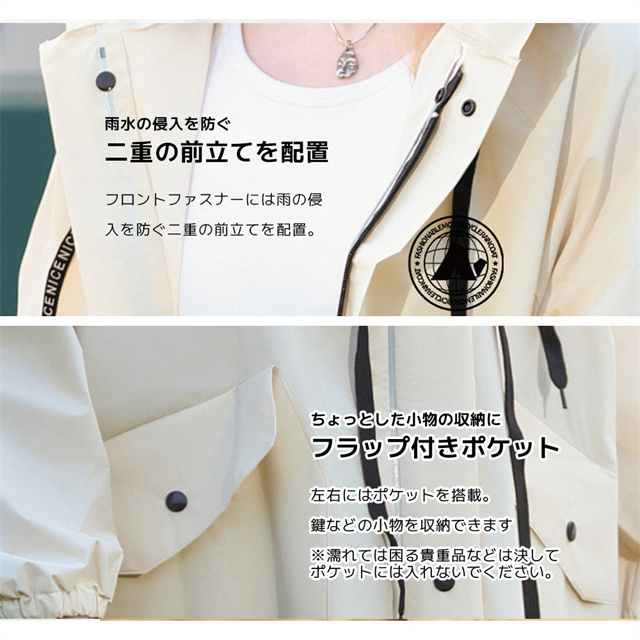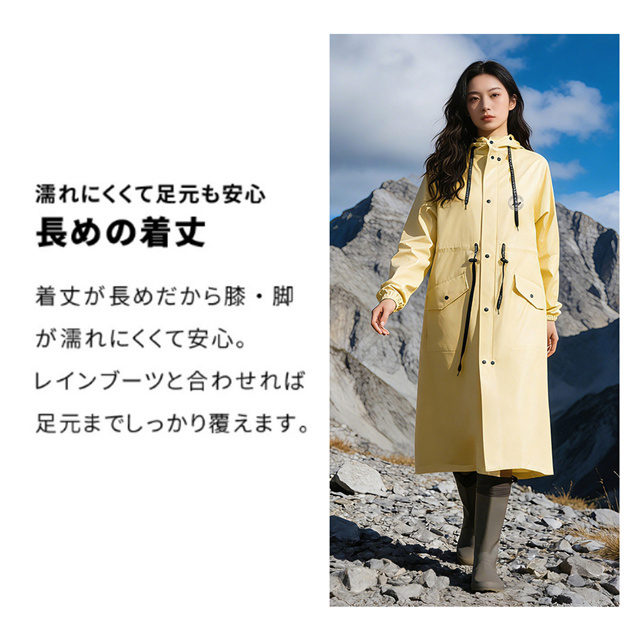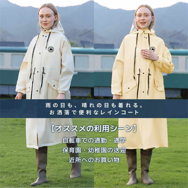| サイズ | ◆日常での使いやすさを重視し、街歩きや自転車運転で便利な機能が満載の快適・スタイリッシュなレインコートです。 ◆防水性と軽さ、素材感にこだわったTPUラミネート加工によって着心地は抜群。 ◆バイザーを付いて広い視界で自転車の運転も安全。メガネの方やメイクを崩したくない女性にも人気! ◆膝下丈のロングコートでレインブーツと合わせれば足元もしっかりガード。 ◆普通のコートに近いシルエットと、普段使いしやすいカラー展開でトレンチコートやスプリングコート感覚で、雨が降りそうなときや止んだ後に着ていても違和感がありませんよ。 ◆軽くて場所を取らないので旅行や職場に置いておくのもオススメ。 ◆雨の日の自転車で、機能もおしゃれも妥協したくない人のための、高い機能性とデザイン性を両立させたレインコートです。 |
