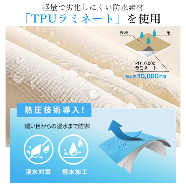| 仕様 | ◆素材 表地:ポリエステル 100% 裏面:TPUラミネート ◆耐水圧:10,000mm ◆重さ:約300g(Mサイズ) |