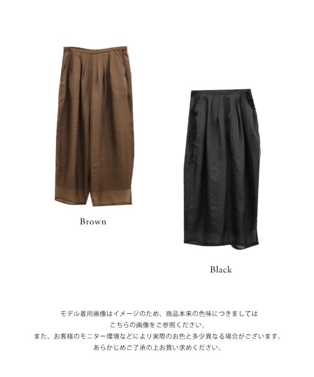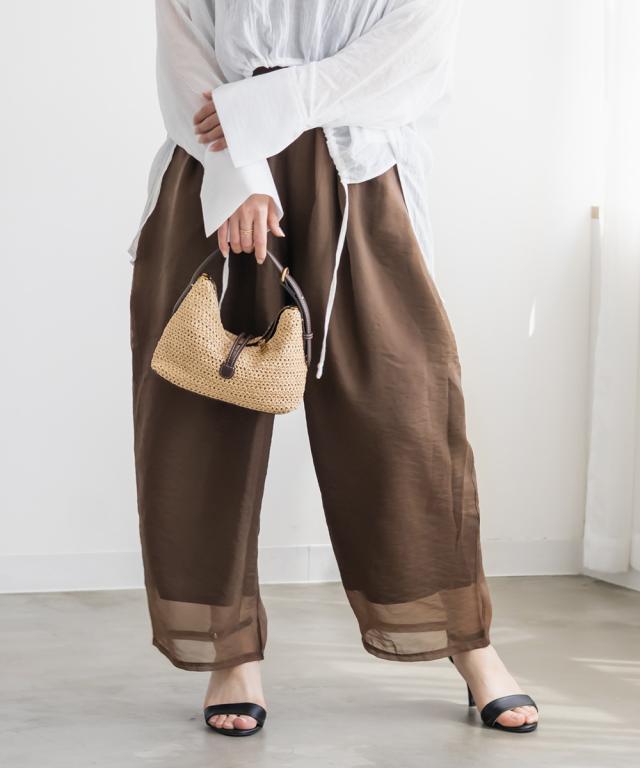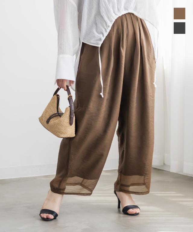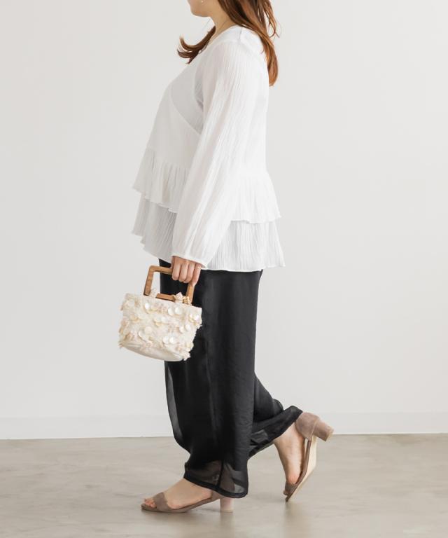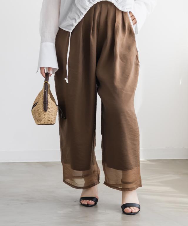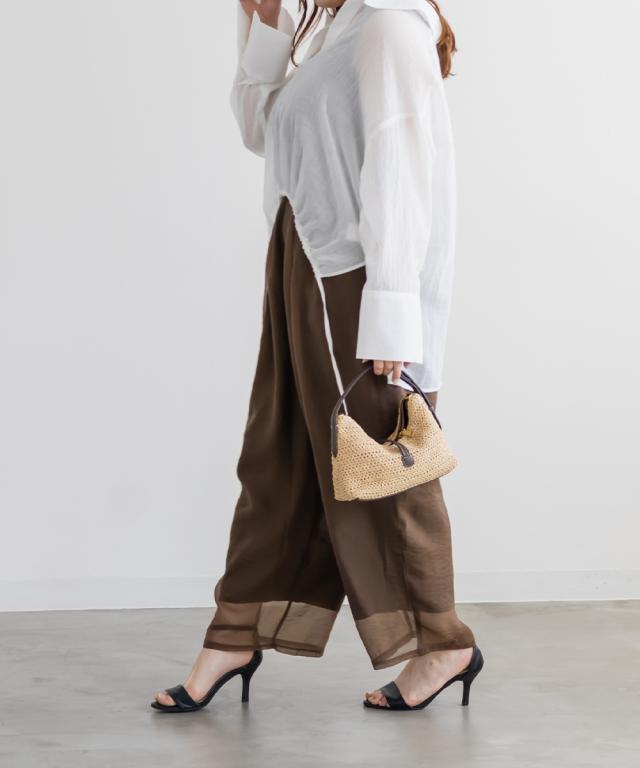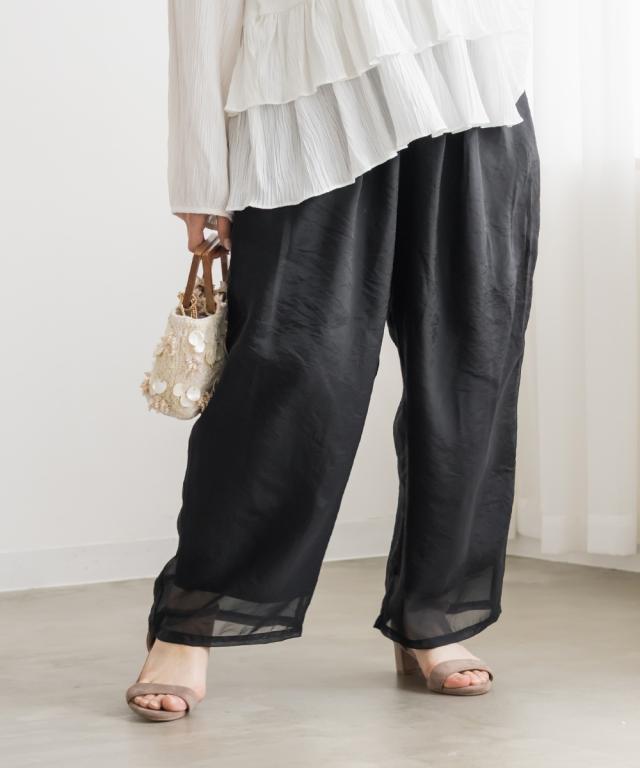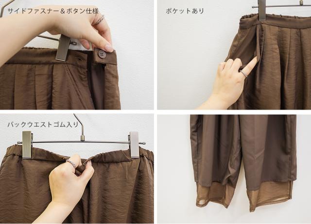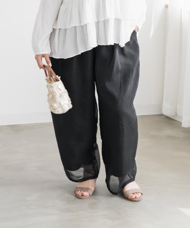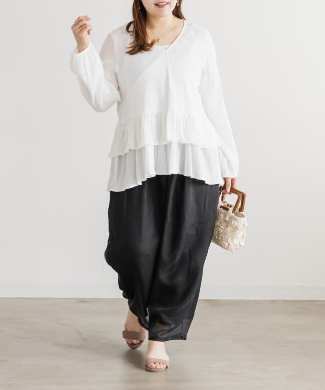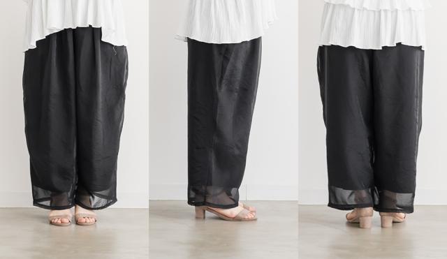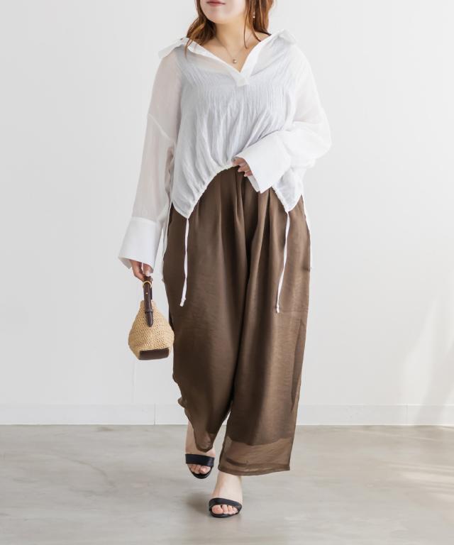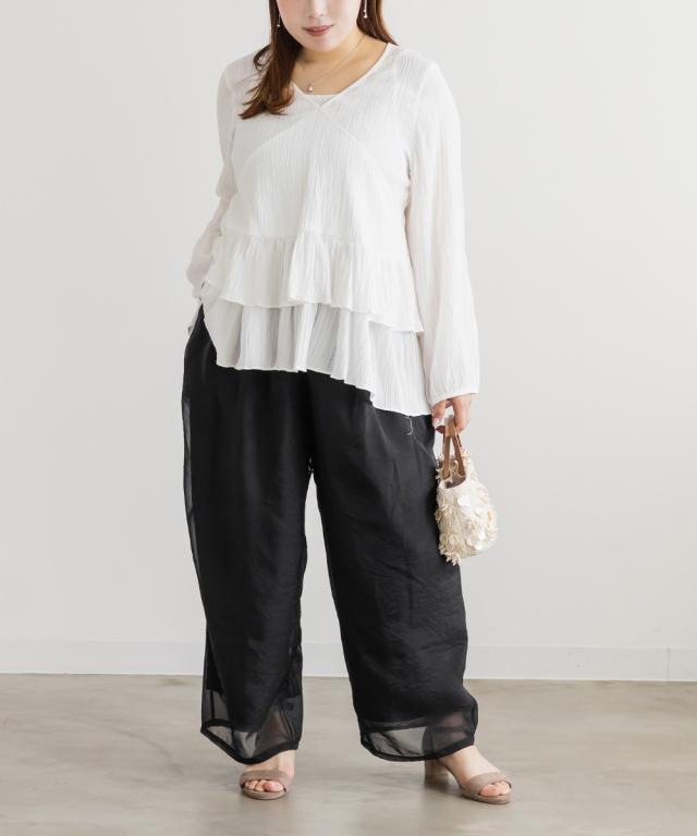 | 3Lサイズを着用しました。ウエストは程よくフィットし、全体的にちょうどいい着心地でした。タック入りでお腹まわりにゆとりがあり、体のラインを拾いにくいのが嬉しいポイント♪ さらっとしたシアー生地が重なっていて自然に立体感を出してくれるので、シンプルなトップスと合わせるだけでもこなれた印象に仕上がります。 軽くて着心地抜群で、ワイドながらも軽やかな雰囲気に◎ ブラウス合わせできれいめに、コンパクトなトップスと合わせてトレンド感のあるバランスを楽しむのもおすすめです。楽さとおしゃれ見えを両立できる一本だと思いました。 |