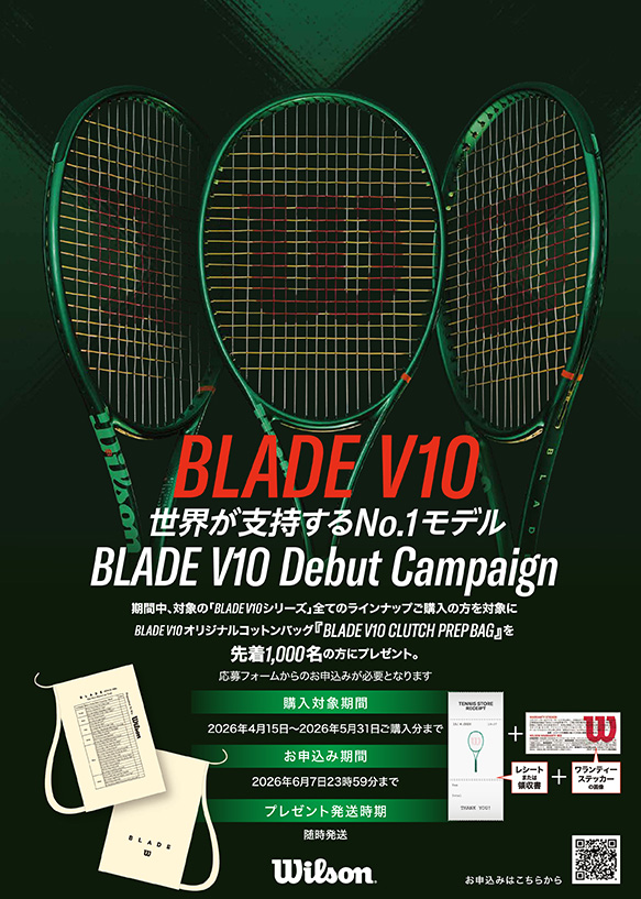 | 特徴 | ATP/WTAツアーで使用率No.1のBLADEシリーズ第10世代。 BLADE独自のしなりと打感を維持しながら、 トルクを調整することで更なる安定性を実現し、トッププレーヤーたちが求める現代のラケットの理想形に辿り着いた。 勝負をかけるときに自信を与えてくれる1本。 |