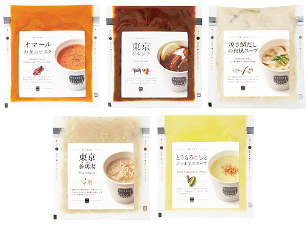 ■コメント: オマール海老のビスク・東京ボルシチ・とうもろこしとさつま芋のスープ・東京参鶏湯・焼き鯛だしの和風スープが入った人気のセットです。