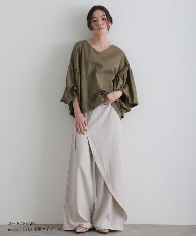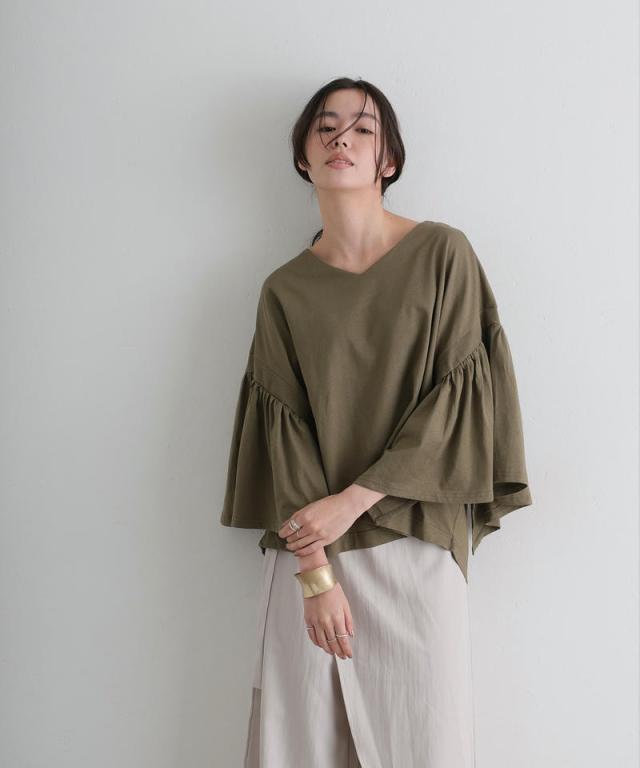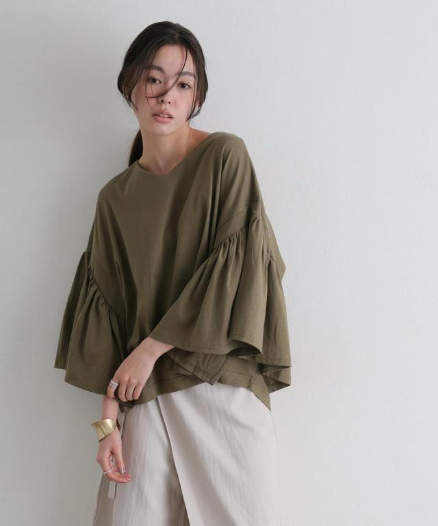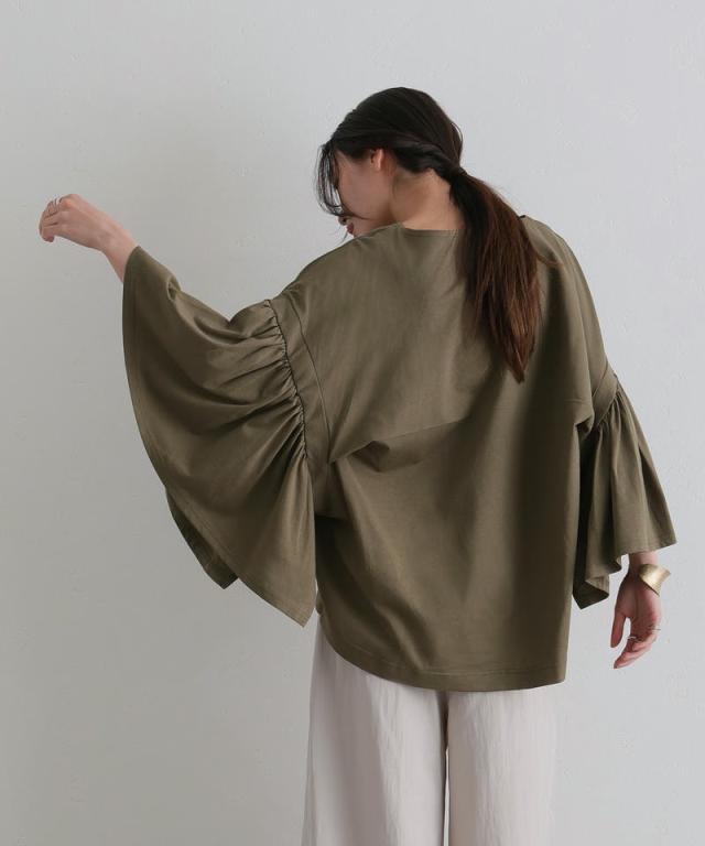 ギャザースリーブ カットソー 着回し 普段着に ショート丈 部屋着 カーキ ドロップショルダー ナチュラル ホワイト ブラック 大人カジュアル 体型カバー 着やせ お出かけ お出掛け着