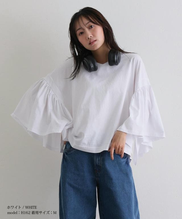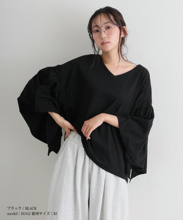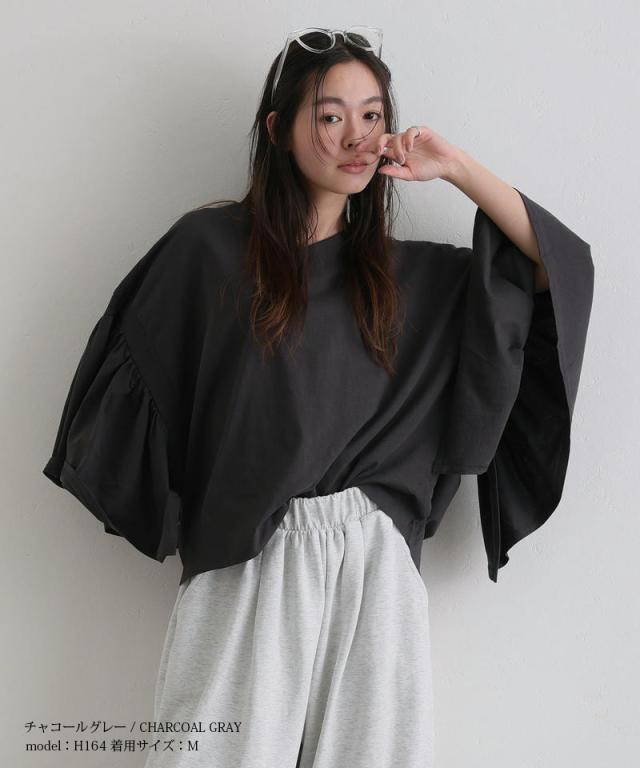 ドロップショルダーギャザースリーブカットソー【625251326】20代・30代・40代・50代・トップス・レディース・カジュアル・半袖・長袖・七分・ノースリーブ・肩出し・Vネック・シンプル・薄手・厚手・無地・刺繍・花柄・可愛い・伸縮性・キレイめ・着やせ・重ね着風・新作・レース・上品・セットアップ・ビジュー・体型カバー・スタイルアップ・小さいサイズ・3Lや4L・即日発送・送料無料・オフィス・ワーク・オールシーズン・デイリー・普段着・オケージョン・セミフォーマル・婚活・顔合わせ・同窓会・お呼ばれ・食事会・謝恩会・親族・七五三・お宮参り・冠婚葬祭・弔事・女子会・デート・入学式・卒業式・入園式・ママ