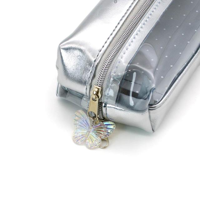 シルバーカラーとクリア素材を組み合わせた、すっきりと洗練された印象のペンケースです。ファスナーにはハートのチャームをあしらい、シンプルな中にさりげない可愛さをプラスしています。
