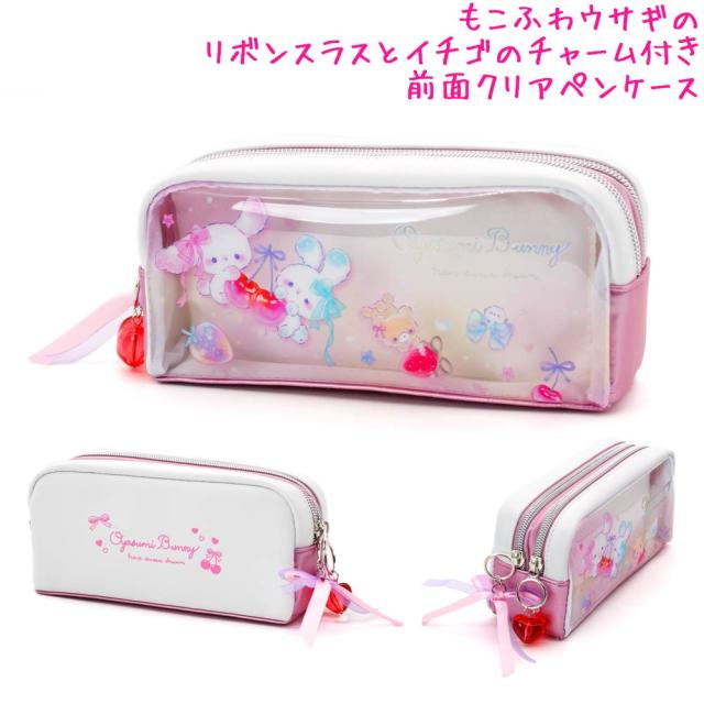 もこふわ素材のうさぎモチーフが目を引く、可愛らしさたっぷりのツインファスナーケースです。リボン×うさぎのデザインに、いちごのチャームが揺れて、持つだけで気分が高まります。