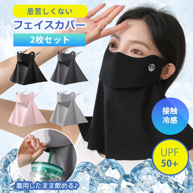 日焼け防止 フェイスカバー UVカット 接触冷感 99%以上 UPF50+ ネックカバー ネックガード 夏用 ひんやり 涼しい ゴルフ テニス スポーツ ランニング レディース 紫外線対策 運転 農作業 耳かけ 2枚