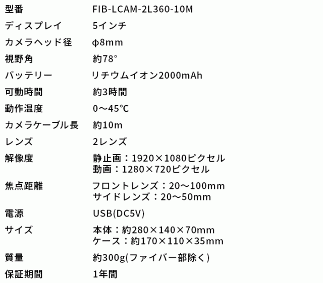 ■ FIB-LCAM-2L360-10M | 直径8mm ケーブル長10m 2レンズ360度回転フルHDファイバースコープカメラ