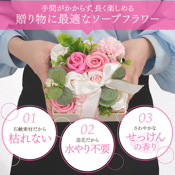 ※ソープフラワーは石鹸素材から作られた香り付きの観賞用のお花のため、普通の石鹸のようにご使用になれません。