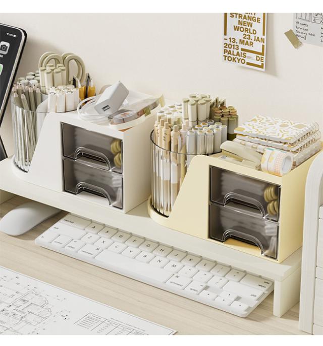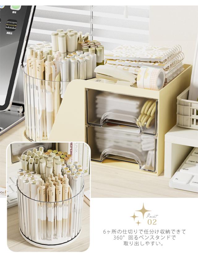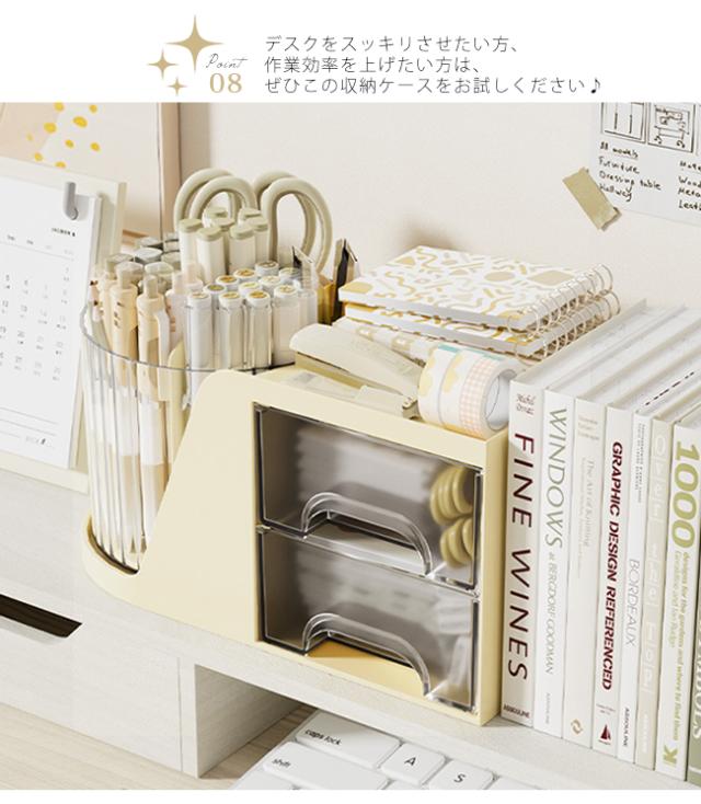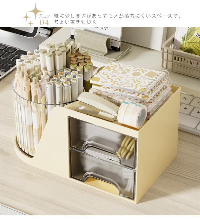 仕切り付きカップ + 2 段引き出し + 上部スペースで、ペン・ノート・小物を一括収納。