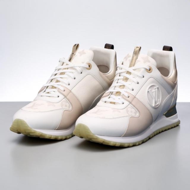 | 商品紹介 "Product introduction" | ランアウェイ スニーカーは、ルイ・ヴィトンがクラシックなランニングシューズを再解釈した、アイコニックな一足です。このバージョンは、しなやかなカーフレザーとパテントモノグラムキャンバスを使用し、ゴールドトーンのメタルプレートとサイドにLVサークルロゴがあしらわれています。ウェッジ型のソールがさりげなくスタイルアップ効果をもたらします。 | |
