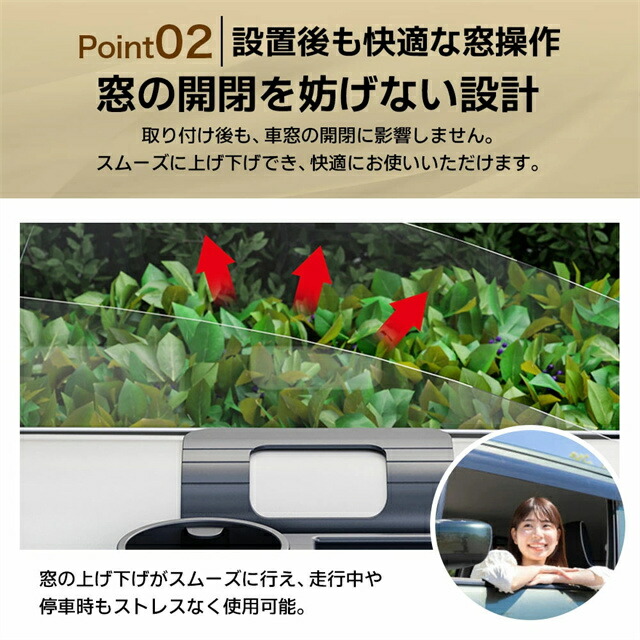 車の窓枠の隙間に差し込むだけ。工具不要で誰でもすぐに取り付け可能。取り付け後も窓の開閉に影響しません。【ポイント2】窓の開閉を妨げない設計