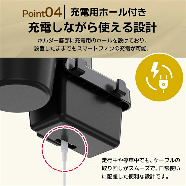 ホルダー底部に充電用ホールを搭載。スマートフォンを収納したまま充電が可能。ナビ使用中や長時間ドライブに便利です。